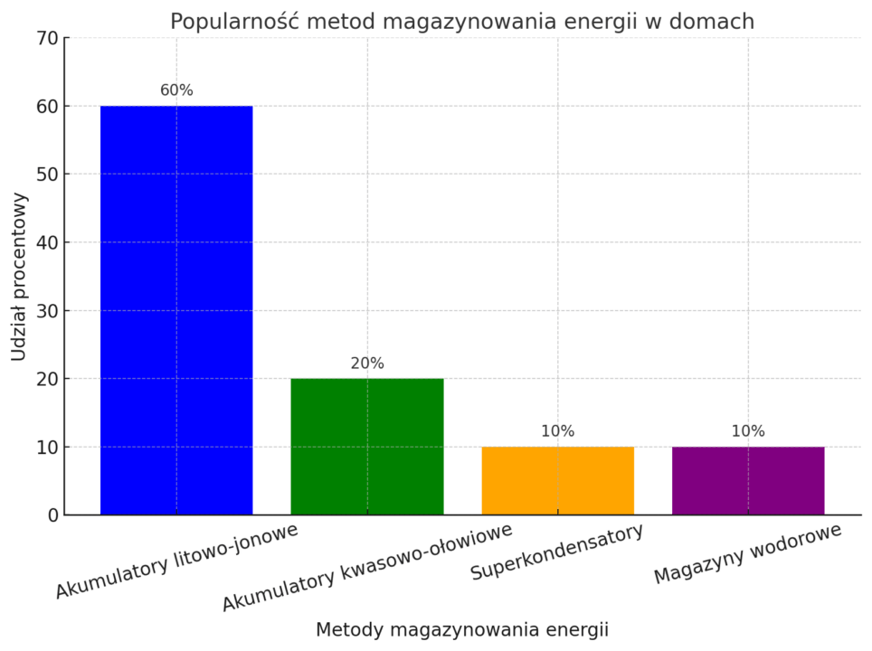 Oto wykres przedstawiający popularność metod magazynowania energii w domach. Dane wskazują na dominację akumulatorów litowo-jonowych, z mniejszym udziałem technologii takich jak akumulatory kwasowo-ołowiowe, superkondensatory i magazyny wodorowe.
