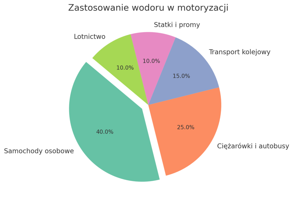 Oto wykres kołowy przedstawiający potencjalne zastosowanie wodoru w motoryzacji. Proporcje wskazują na różne sektory, takie jak samochody osobowe, ciężarówki i autobusy, transport kolejowy, statki i promy oraz lotnictwo.
